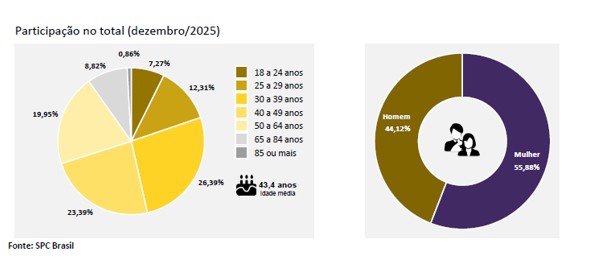 A análise do perfil dos devedores reincidentes em dezembro de 2025 aponta que a faixa etária de 30 a 39 anos continua sendo a mais representativa, com 26,39% do total. Quanto à participação por sexo, a distribuição se mantém equilibrada: 55,88% mulheres e 44,12% homens.