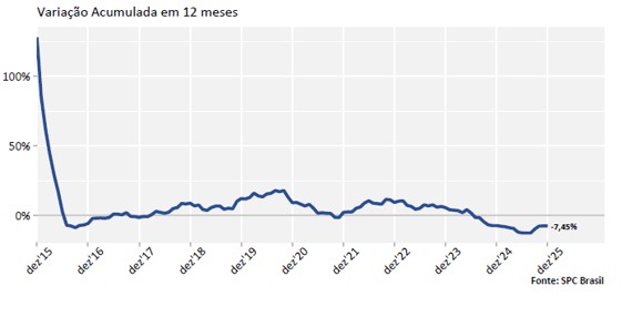 Paralelamente à alta reincidência, o Indicador de Recuperação de Crédito de Pessoas Físicas, que acompanha o número de consumidores que conseguiram sair dos cadastros de inadimplentes, registrou uma queda ainda mais acentuada. Nos 12 meses encerrados em dezembro de 2025, houve uma redução de ‐7,45% no número de consumidores que limparam o nome, em comparação com os 12 meses anteriores.