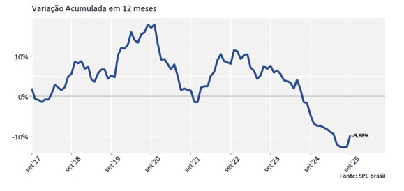 Paralelamente à alta reincidência, o Indicador de Recuperação de Crédito de Pessoas Físicas, que acompanha o número de consumidores que conseguiram sair dos cadastros de inadimplentes, registrou uma queda ainda mais acentuada. Nos 12 meses encerrados em setembro de 2025, houve uma redução de ‐9,68% no número de consumidores que limparam o nome, em comparação com os 12 meses anteriores.