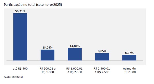 O valor médio pago por consumidor recuperado em setembro de 2025 foi de R$ 2.296,54 na soma de todas as dívidas que tinha. Os dados ainda mostram que 56,71% pagaram até R$ 500 nas dívidas que possuíam.
