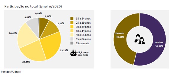 A análise do perfil dos devedores reincidentes em janeiro de 2026 aponta que a faixa etária de 30 a 39 anos continua sendo a mais representativa, com 25,28% do total. Quanto à participação por sexo, a distribuição se mantém equilibrada: 53,82% mulheres e 46,18% homens.
