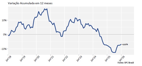 Paralelamente à alta reincidência, o Indicador de Recuperação de Crédito de Pessoas Físicas, que acompanha o número de consumidores que conseguiram sair dos cadastros de inadimplentes, registrou uma queda ainda mais acentuada. Nos 12 meses encerrados em janeiro de 2026, houve uma redução de ‐6,82% no número de consumidores que limparam o nome, em comparação com os 12 meses anteriores.